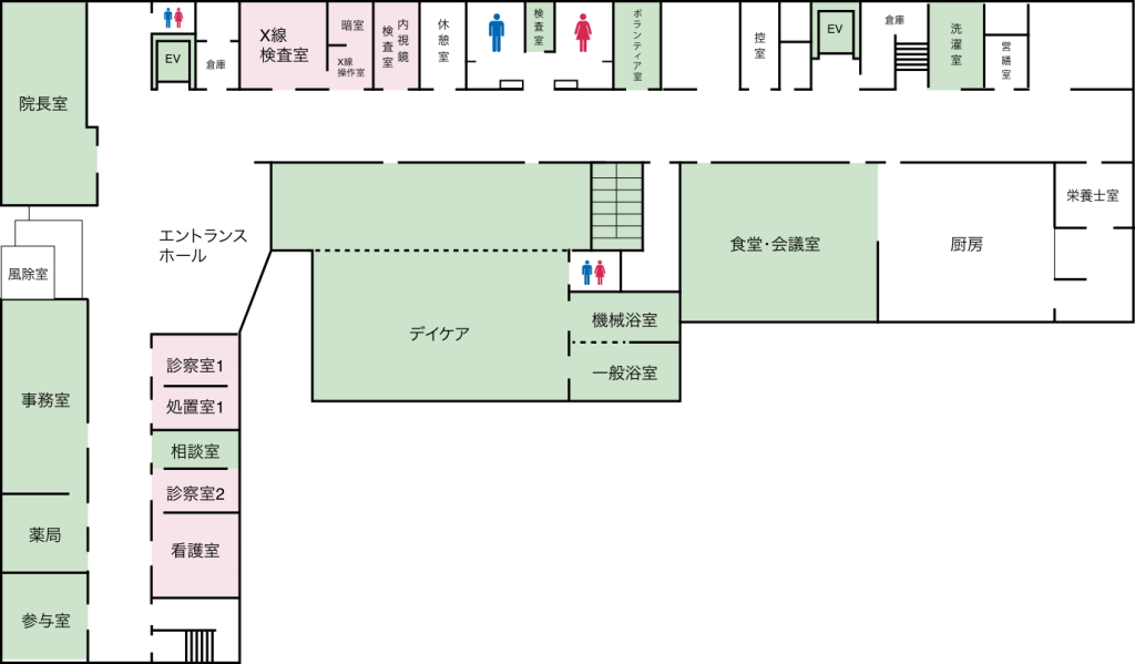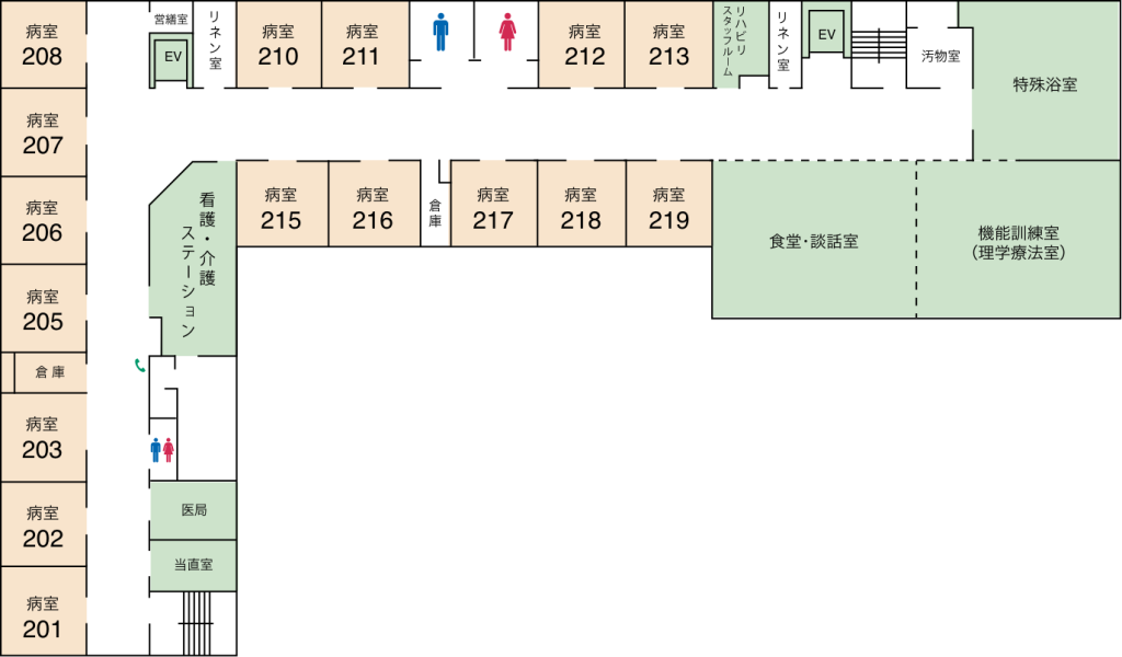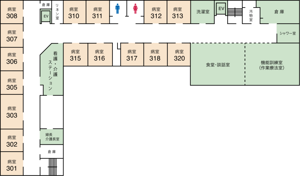 | 設備 | 全館冷暖房完備/全室オゾン脱臭装置 温冷配膳車による適時適温の食事 多種リハビリテーション機器設備 |