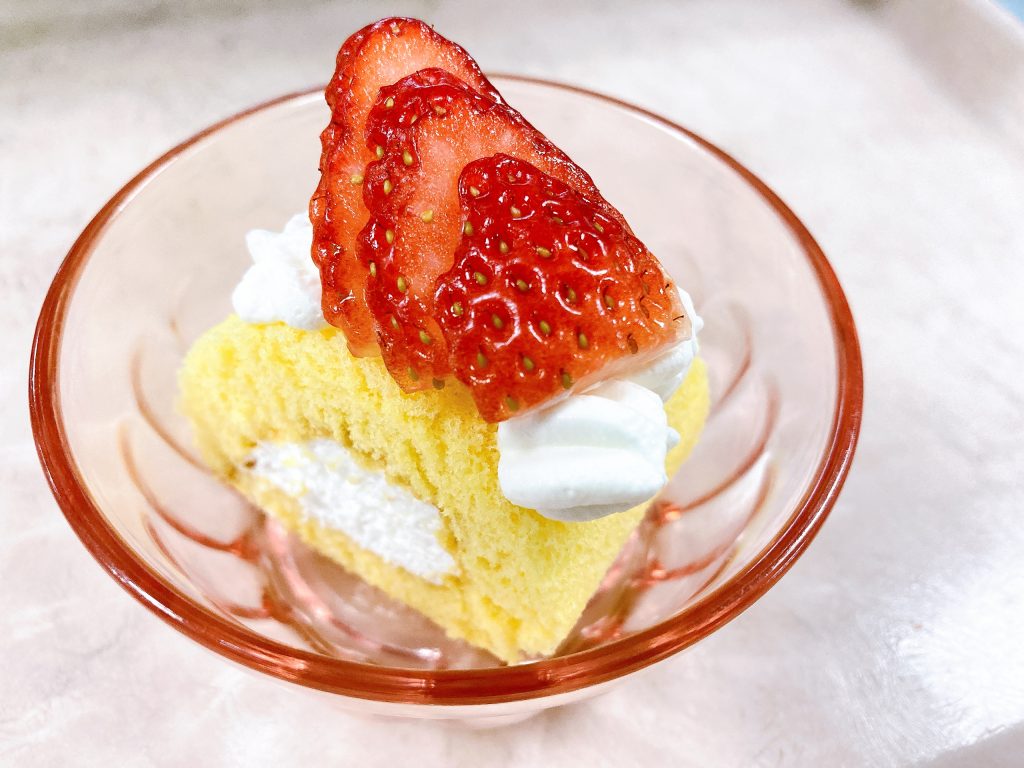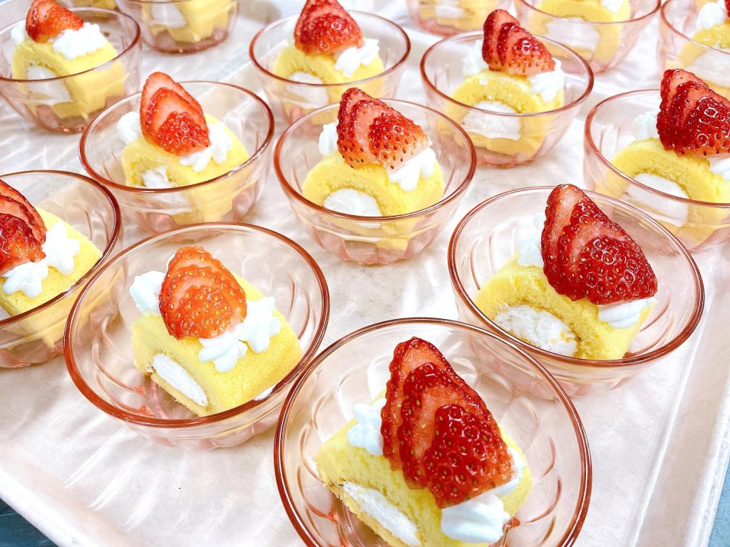 生クリームは栄養科職員がホイップし絞りいちごを盛り付けています。
