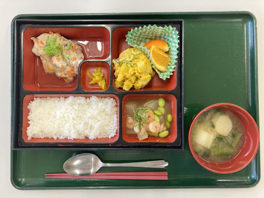 ・えびシューマイ ・枝豆 ・さくら漬け ・ご飯 ・バナナ ・味噌汁