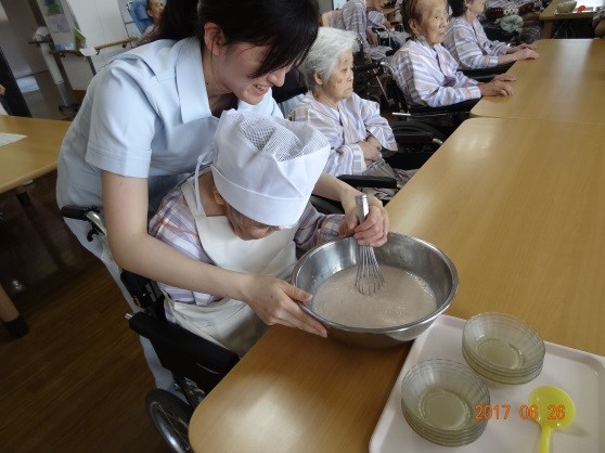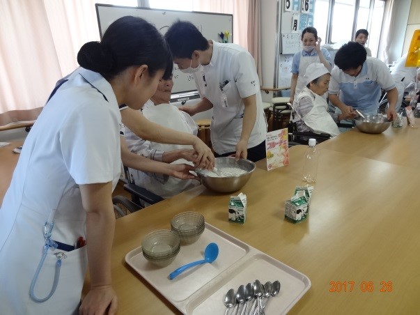 今日は病棟行事、手作りおやつ(フルーチェ作り)の日です